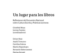 Un Lugar para los libros : reflexiones del Encuentro Nacional sobre Cultura Escrita y Prácticas Lectoras / Cristóbal Moya, Lorena Fuentes (coordinadores) ; autores: Grínor Rojo [y otros]. Santiago, Chile : LOM Ediciones, 2016 (Santiago de Chile : Talleres de LOM) 158 páginas : ilustraciones ; 21 cm. .