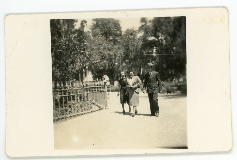 [Dos mujeres junto a un hombre caminando por la vereda] [Fotografía].