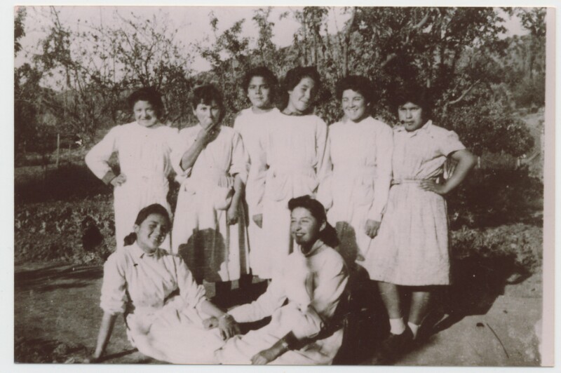 [Compañeras de curso de la Escuela Técnica Femenina de Los Andes : María Salinas, Fresia Urbina, Miguelina González, Rosa Figueroa, Inés Ponce, Cecilia Caicedo] [Fotografía].
