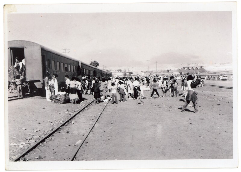 [Arribo de pasajeros en tren] [Fotografía].