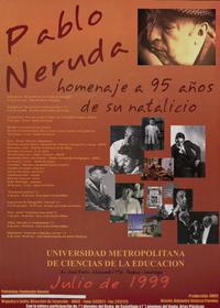 Pablo Neruda homenaje a 95 años de su natalicio. [estampa] : Santiago, Chile : Dirección de Extensión-UMCE, 1999. 1 cartel (afiche) : color ; 53 x 38 cm. .