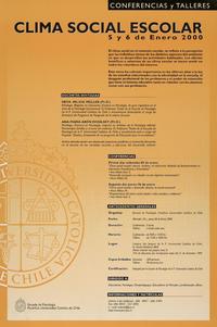Conferencias y talleres: clima social escolar 5 y 6 de enero 2000. [estampa] : Santiago, Chile : Pontificia Universidad Católica de Chile, Escuela de Psicología, 2000. 1 cartel (afiche) : color ; 60 x 40 cm. .