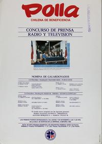 Polla chilena de beneficencia Concurso de prensa, radio y televisión. [estampa] : Chile : Polla Chilena de Beneficencia,, [199-?] (Chile : Talleres de Editorial Universitaria). 1 cartel (afiche) : color ; 54 x 38 cm. .