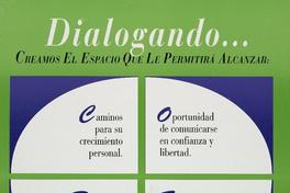 Dialogando... creamos el espacio que le permitirá alcanzar caminos para su crecimiento personal. Oportunidad de comunicarse en confianza y libertad. Respuestas a inquietudes personales, familiares y laborales. Formas para enfrentar conflictos con su pareja. [estampa] :