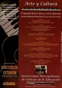 Arte y Cultura V temporada oficial de música y ciclo de conferencias. [estampa] : Santiago, Chile : 1 cartel (afiche) : color ; 52 x 37 cm. .