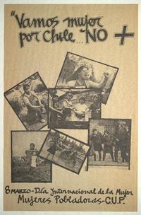 "Vamos mujer por Chile...No + 8 marzo-día internacional de la mujer : Mujeres Pobladoras-C.U.P. [estampa] / [Chile] : [Editor no identificado], [198-?]. 1 cartel (afiche) : blanco y negro ; 42 x 28 cm. .