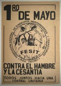 1ro. de mayo: contra el hambre y la cesantia todos juntos hacia una central unitaria. [estampa] : [Chile] : Federación Nacional de Sindicatos Independientes y Transitorios, [198-?]. 1 cartel (afiche) : color ; 55 x 38 cm. .
