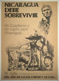 Nicaragua debe sobrevivir un cuaderno y un lápiz para Nicaragua. [estampa] : [Chile] : [Editor no identificado], 1986. 1 cartel (afiche) : blanco y negro ; 51 x 36 cm. .