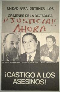 Unidad para detener los crimenes de la dictadura ¡castigo a los asesinos!. [estampa] : [Chile] : [Editor no identificado], [198-?]. 1 cartel (afiche) : color ; 55 x 35 cm. .