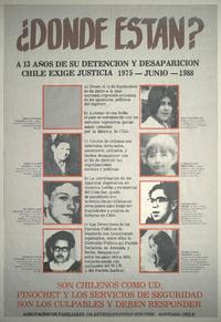 ¿Dónde están? a 13 años de su detención y desaparición Chile exige justicia 1975-junio-1988. [estampa] : Santiago, Chile : Agrupación de Familiares de Detenidos-Desaparecidos, 1988. 1 cartel (afiche) : color ; 54 x 37 cm. .