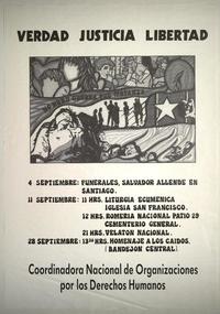 Verdad justicia libertad Coordinadora Nacional de Organizaciones por los Derechos Humanos. [estampa] : Santiago, Chile : [Editor no identificado], [198-?]. 1 cartel (afiche) : blanco y negro ; 55 x 39 cm. .