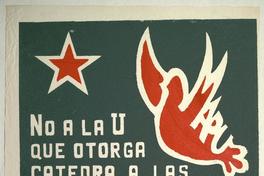 No a la U que otorga cátedra a las formas de tiranía y refugio a los mediocres elecciones libres ahora. [estampa] : [Chile] : [Editor no identificado], [199-?]. 1 cartel (afiche) : color ; 43 x 33 cm. .