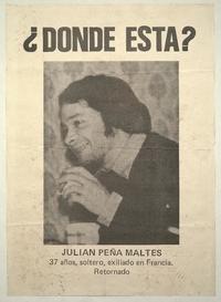 ¿Dónde está? Julián Peña Maltés: 37 años, soltero, exiliado en Francia. Retornado. [estampa] : [Chile] : [Editor no identificado], [198-?]. 1 cartel (afiche) : blanco y negro ; 38 x 28 cm. .