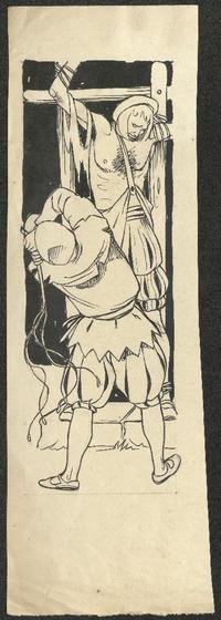 Un hombre es azotado. En el reverso anotación manuscrita con los nombres de la esposa y dos hijos del autor.