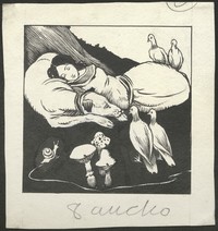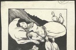 Una mujer recostada junto a un perro, redeada de aves. Dibujo publicado en El Peneca 1511, del 29 de noviembre de 1937, como parte de la serie En el país de las maravillas.