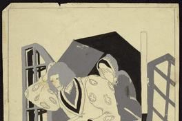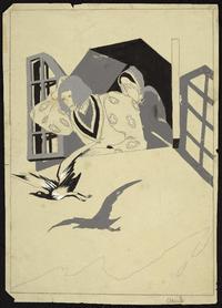 En el dibujo hay un hombre y una mujer asomados a una ventana, la mujer tapa su rostro con sus manos y un ave vuela cerca de ellos. Dibujo publicado en la contraportada de El Peneca 1526, del 14 de marzo de 1938, como parte de la serie Dorigen.
