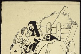 Dibujo de una mujer, una niña y dos bueyes arrastrando una carreta en donde llevan pasto o forraje.