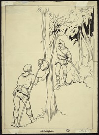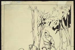 Dibujo de la revista El Peneca con dos hombres en medio de un bosque, uno porta un morral amarrado a una vara y el otro lleva una espada.