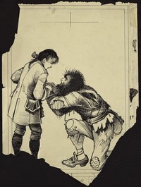 En el dibujo se encuentran dos hombre, uno de ellos está arrodillado en actitud de suplica. Dibujo publicado en El Peneca 1545, del 25 de julio de 1938, como parte de la serie La isla del tesoro.