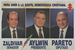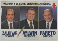 1 Afiche con imagen de Aylwin, Zaldívar y Pareto para las presidenciales del año 1989. Afiche incluye logo del partido Democrata Cristiano.
