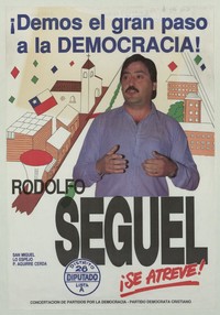 Afiche de Rodolfo Seguel en campaña para Diputado en 1989, Distrito 28, Lista A: San Miguel, Lo Espejo, Pedro Aguirre Cerda.