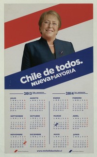 Chile de todos Nueva Mayoría. [estampa] : [Chile] : [Editor no identificado], [2013]. 1 calendario (afiche) : color ; 41 x 25 cm. .