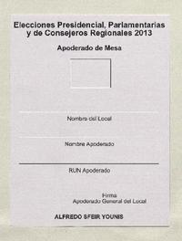 Elecciones presidencial, parlamentarias y de consejeros regionales 2013 apoderado de mesa. [estampa] :