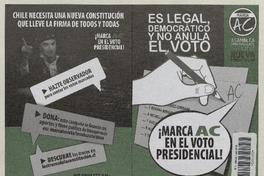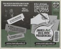 ¡Marca AC en el voto presidencial! es legal, democrático y no anula el voto. [estampa] : [Chile] : [Editor no identificado], [2013]. 1 hoja plegada : ilustraciones ; 20 x 26 cm. plegada a 20 x 13 cm. .