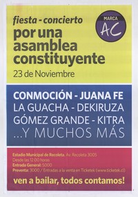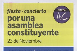Fiesta-concierto por una Asamblea Constituyente 23 de noviembre. [estampa] : Recoleta, Santiago : [Editor no identificado], [2013]. 1 cartel (afiche) : color ; 102 x 72 cm. .