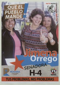 Jimena Orrego Senadora H-4 tus problemas, mis problemas. [estampa] : [Chile] : [Editor no identificado], [2013]. 1 cartel (afiche) : color ; 50 x 35 cm. .