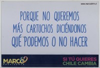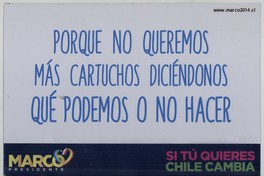 Porque no queremos más cartuchos diciéndonos qué podemos o no hacer [estampa]. [Chile] : [Editor no identificado], [2013]. 1 pizarra acrílica : formica ; 40 x 60 cm. .