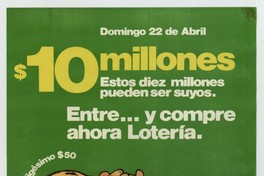 La colección consta de 6 afiches: 1.$10 millones, Domigno 22 de Abril. Estos diez millones pueden ser suyos. Entre... y compre ahora Lotería--2.$10 millones, Domingo 3 de Junio. Piense... Cada vez que deje pasar Lotería, pierde una oportunidad de ganar millones de pesos--3.$10 millones, Domingo 6 de Mayo. No deje pasar esta oportunidad... hoy usted puede estar de suerte!--4.$10 millones, Domingo 15 de Julio. Protéjase de los problemas...Juegue Lotería--5.$10 millones, Domingo 8 de Abril. No viva soñando... Compre Lotería hoy--6.$10 millones, Domingo 20 de Mayo. Juegue. Cómo sabe si gana...