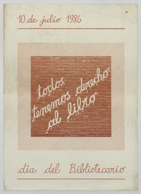 10 de Julio 1986 Día del Bibliotecario todos tenemos derecho al libro. [estampa] : [Santiago, Chile] : [Editor no identificado], 1986. 1 cartel (afiche) : color ; 51 x 37 cm. .