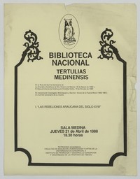 Las rebeliones araucana del siglo XVIII Biblioteca Nacional de Chile, Tertulias Medinensis. [estampa] / Santiago, Chile : La Biblioteca, 1988. 1 catel (afiche) : 2 colores ; 28 x 36 cm. .