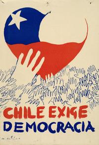 Chile exige democracia [estampa] : Nemesio Antúnez. Chile : Nemesio Antúnez, [1988]. 1 cartel (afiche) : color ; 38 x 26 cm. .