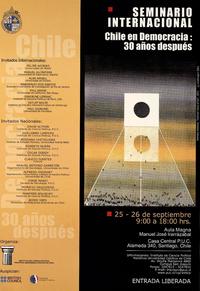 Afiche publicitario de un seminario realizado en la Universidad Católica de Chile, cuyo eje central fué el análisis a los 30 años de democracia en Chile posteriores al retorno a la democracia.