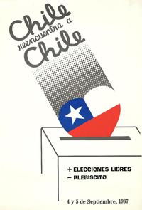 Chile reencuentra a Chile elecciones libres. [estampa] : Chile : [Editor no identificado], 1987. 1 cartel (afiche) : color ; 57,5 x 37,5 cm. .