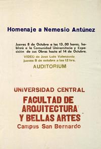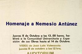 Afiche para la difusión de un homenaje rendido a Nemesio Antúnez el que constaba de una charla y exposición por parte del artista y la proyección de un video de José Luis Valenzuela.