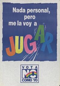 Nada personal, pero me la voy jugar vota no como yo. [estampa] : [Chile] : [Editor no identificado], [1988]. 1 cartel (afiche) : color ; 55 x 38 cm. .