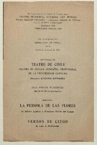 Díptico con el programa del Teatro de Chile, Teatro de ensayo compañía profesional de la Universidad Católica, "La pergola de las flores" de Isidora Aguirre y Francisco Flores del Campo y "Versos de ciego" de Luis A. Heiremans, funciones en Argentina.