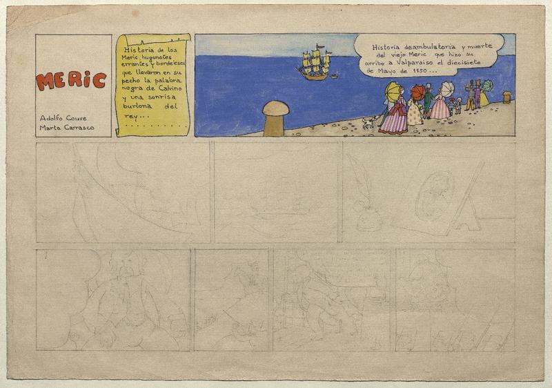 Meric [original de arte] / Marta Carrasco y Adolfo Couve. [Santiago, Chile] : [Editor no identificado], [196-?]. 1 dibujo : tinta y lápiz sobre papel ; 38,5 x 55 cm. .