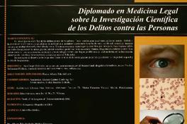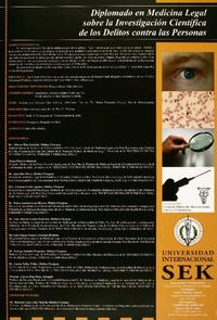 Diplomado en medicina legal sobre la investigación científica de los delitos contra las personas [estampa]. Santiago : Universidad Internacional SEK, 2002. 1 cartel (afiche) : color ; 50 x 34 cm. .