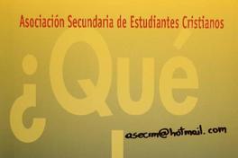 Asociación Secuandaria de Estudiantes Cristianos ¿Qué es la ASEC?. [estampa] : [Santiago] : [Editor no identificado], [200-?]. 1 cartel (afiche) : color ; 50 x 34 cm. .