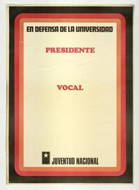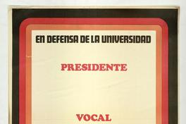 En defensa de la universidad presidente, vocal / [estampa] : Daniel Gleiser. [Santiago, Chile] : [Editor no identificado], [196-?]. 1 cartel (afiche) : color ; 77 x 55 cm. .