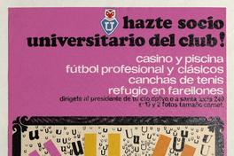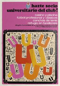 Hazte socio universitario del club! [estampa] / Daniel Gleiser. [Santiago, Chile] : [Editor no identificado], [196-?]. 1 cartel (afiche) : color ; 54,5 x 37 cm. .