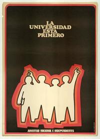 La universidad esta primero [estampa] / Daniel Gleiser. [Santiago, Chile] : [Editor no identificado], [196-?]. 1 cartel (afiche) : color ; 68 x 55 cm. .