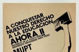 A conquistar nuestro derecho a la educación ahora!! [estampa] : Chile : [Editor no identificado], [197-?]. 1 cartel (afiche) : 67 x 47 cm. .
