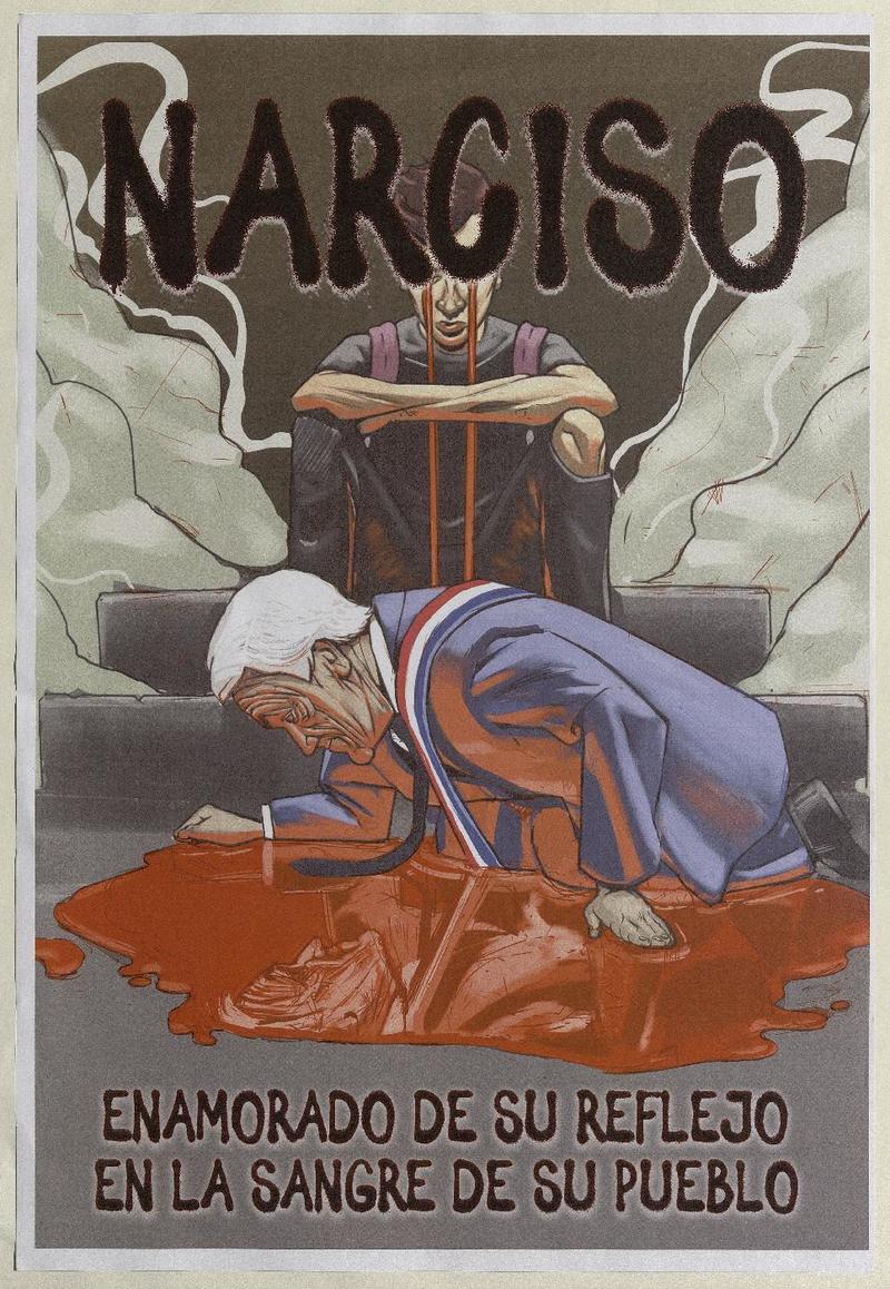 Narciso enamorado de su reflejo en la sangre de su pueblo [estampa] : Nicolás Cataldo Montoya.