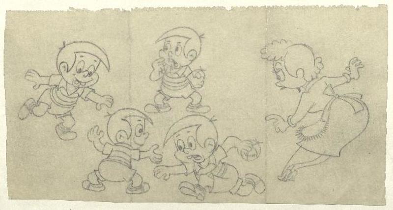 [Bocetos personajes Cornejito, Pantruca, Peneca, Cachupín, Carboncito, Don Minino, Pituto, Puchito] [original de arte] Renato Andrade ; seudónimo: Nato.