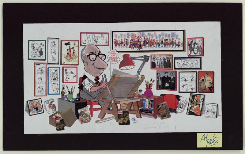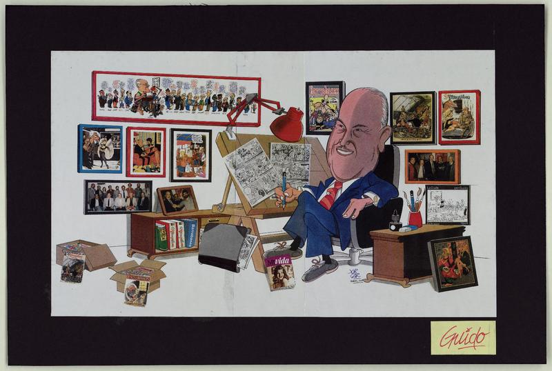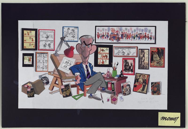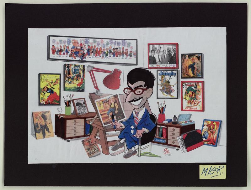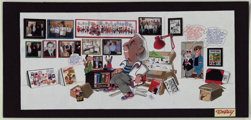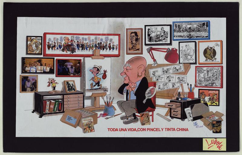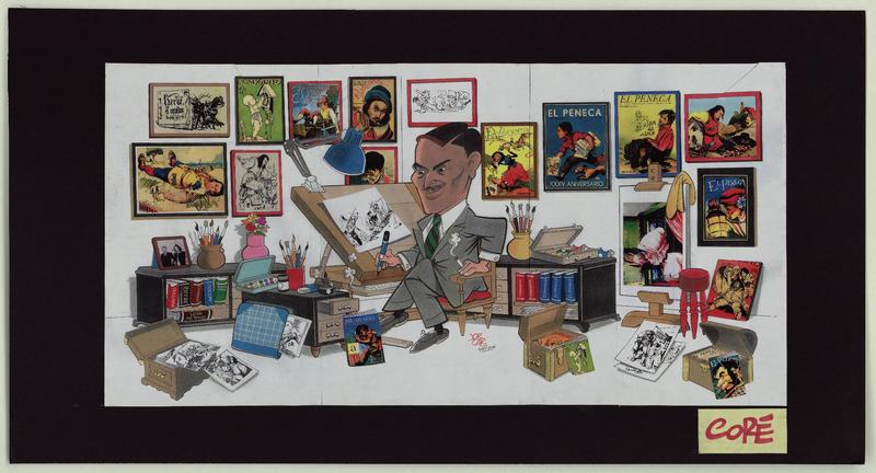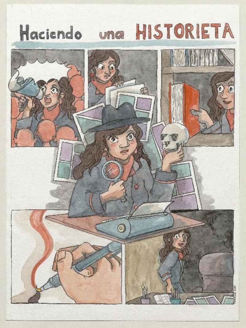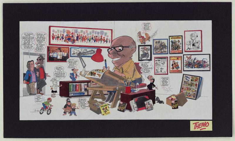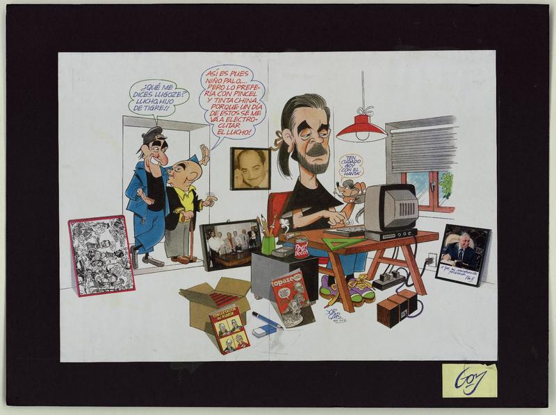 Dibujos originales de autores chilenos realizados en diversas técnicas, formatos y soportes, además de fotografías de creadores y afiches relativos a la producción de la historieta nacional.